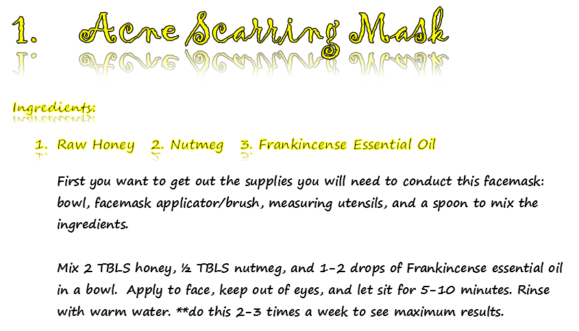 Nutmeg helps reduce scarring and Frankincense Essential Oil helps reduce acne.